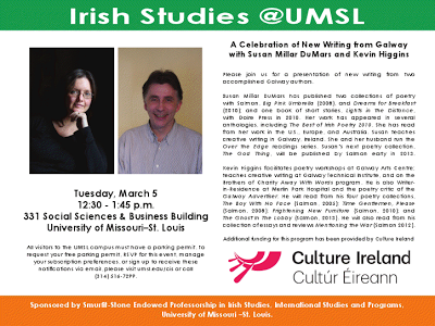 The reading is generously supported by Culture Ireland http://www.cultureireland.ie & sponsored by the Smurfit-Stone Endowed Professorship in Irish Studies, International Studies & Programs, University of Missouri-St. Louis. http://www.umsl.edu/services/cis/files/pdfs/galwaywriters.pdf
